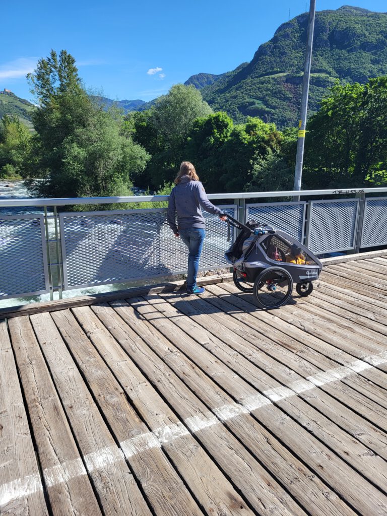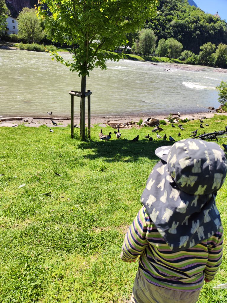 Der Morgen begann mal wieder ziemlich früh, gegen 6 Uhr wachte ViP auf. Ich nahm ihn nochmal mit zu uns ins Bett und wir dösten noch ein wenig. Allerdings hatte er irgendwie keine Lust mehr rumzuliegen, deshalb beschlossen wir aufzustehen und zu frühstücken. Nach dem Frühstück machten wir uns fertig und gingen auf Erkundungstour durch die Stadt. Unser Hauptziel war der Waltherplatz. Der Weg führte über den Talferbach, direkt vorbei am Archäologiemuseum, wo der weltbekannte Ötzi ausgestellt ist. Den Eintritt sparten wir uns, weil uns ein Museumsbesuch mit ViP nicht wirklich lohnenswert erscheint. Also ging es weiter Richtung Altstadt. Durch enge Gassen, vorbei an kleinen Läden und Geschäften. Nach gut 30min hatten wir ihn erreicht, den Waltherplatz. Hier gibt es einen großen Springbrunnen mit einer Statute von „Walther von der Vogelweide“. Natürlich konnte es ViP nicht schnell genug gehen, aus seinem Qeridoo auszusteigen, um Richtung Brunnen zu „rennen“. Dort angekommen, krabbelte er die 2 Stufen hoch und versuchte seine Hand ins Wasser zu tauchen. Dies funktionierte allerdings nicht, da noch ein großer Vorsprung zu bewältigen war, den er aber nicht alleine hochkam. Ich half ihm hoch und schon tauchte er seine Hände ins kalte Nass. Ich hielt ihn fest, weil er sonst mit dem ganzen Körper hineingefallen wäre. Nach ein paar Minuten mit den Händen im Wasser planschend, beschlossen wir unseren Stadtbummel fortzusetzen. Auf der anderen Straßenseite, vom Waltherplatz, befindet sich der Dom Maria Himmelfahrt. Leider konnten wir diesen nicht besichtigen, aber auch von außen sah er imposant aus, vor allem das Dach. Weiter ging es Richtung Süden Richtung Talferbach, vorbei am Kapuzinerpark. Am Ufer des Talferbachs angekommen, machten wir eine kurze Pause und gönnten ViP etwas Auslauf. Den Auslauf nutzte er, um Enten und Tauben am Flussufer zu beobachten. Nach etwa 20min machten wir uns auf, weiter Richtung Schloss Maretsch, direkt am Wasser entlang. Kurz vor dem Ziel entschlossen wir uns, auf einer Bank Mittag zu essen. Denn ViP zog es langsam die Augen zu, aber er sollte nicht mit leeren Magen schlafen. Nachdem er fertig war, packten wir ihn in seinen Qeridoo und ein paar Meter weiter schlief er dann auch schon. Wir suchten uns eine Bank, um selber etwas zu essen. Gemeinsam essen wird immer schwieriger, da er genau das gleiche essen möchte, was wir haben. Das geht allerdings nicht immer. Der Mittagsschlaf war nicht von langer Dauer, nach ca. 45min wachte er wieder auf, mit sehr schlechter Laune. Wir beschlossen zurück zur Wohnung zu gehen, um ihn dort nochmal etwas hinzulegen. Der Plan ging allerdings nicht auf. Er hatte absolut keine Lust weder in seinem Bettchen, noch auf meinem Bauch, geschweige denn in unserem Bett zu schlafen. Also packten wir wieder unsere Sachen und machten uns auf den Weg zum nahegelegenen Spielplatz, denn die Sonne schien schon den ganzen Tag. Am Spielplatz angekommen, mussten wir feststellen, dass auch andere die Idee hatten, dass Wetter nochmal zu nutzen. Wir packten uns auf unsere Decke und vesperten erstmal. Gestärkt ging es dann zum Spielplatz, auf dem ViP alle vorhandenen Sachen ausprobierte. Rutschen, Schaukeln, im Sandkasten spielen, zu anderen Kindern gehen, um das Spielzeug von ihnen zu bekommen, mit Papa Ball spielen oder einfach nur alles beobachten. Dann war es auch schon wieder an der Zeit, uns auf den Heimweg zu machen, tja wenn man mittags nur 45min schläft, wird man abends schneller müde (soll nicht heißen, dass er morgen dafür später aufsteht). Zuhause angekommen ging es für ihn noch schnell unter Dusche, bevor es Abendessen gab.