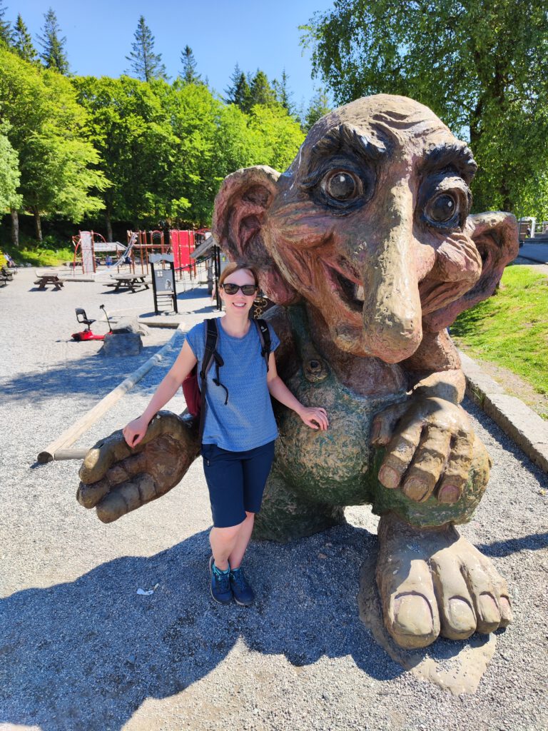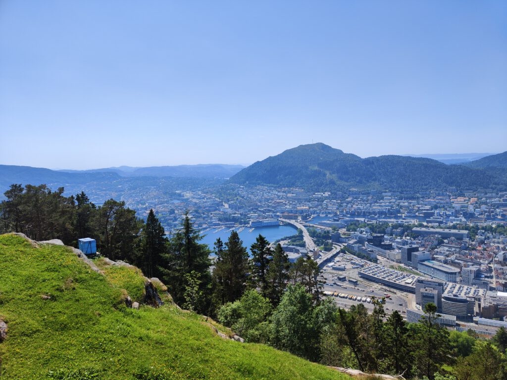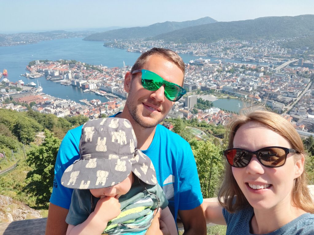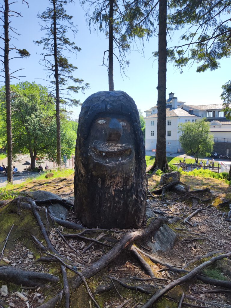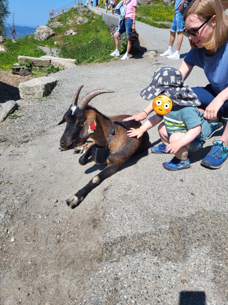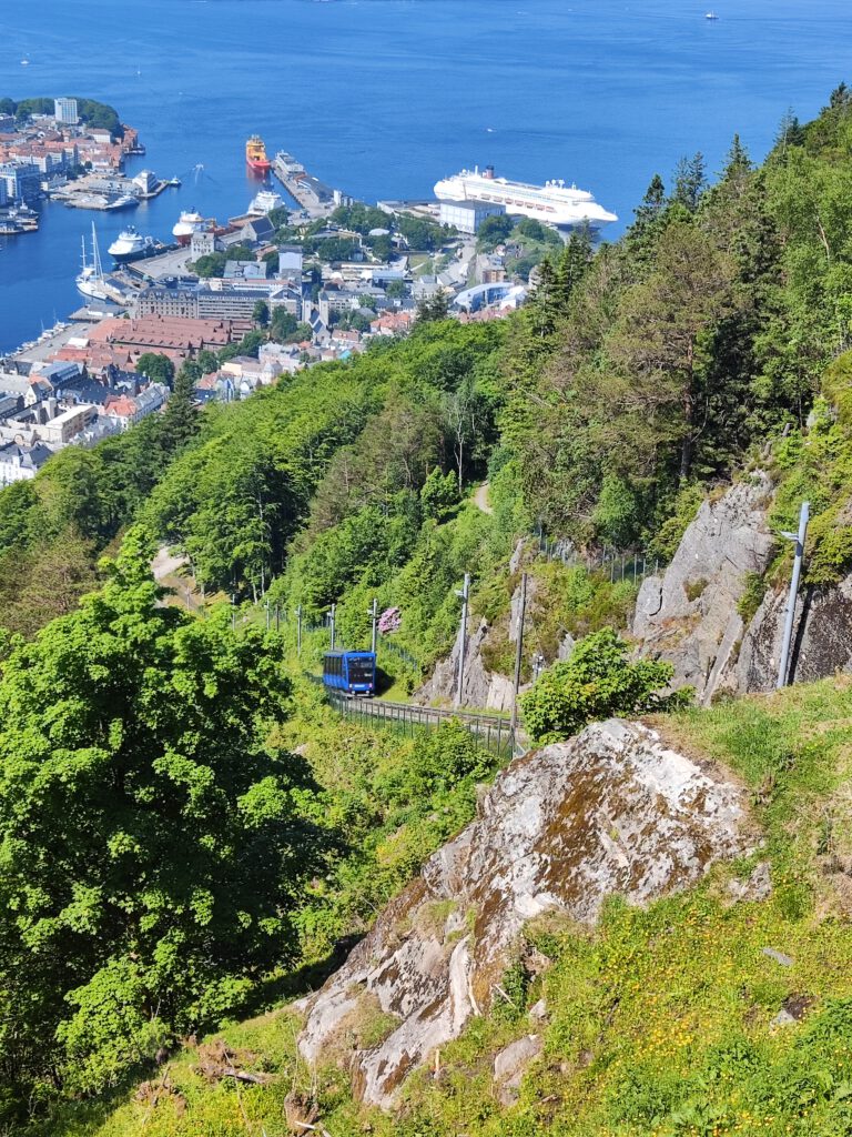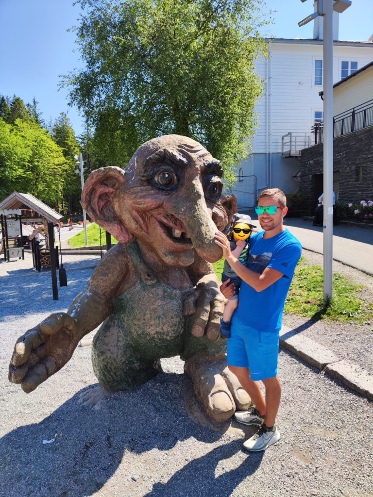 Guten Morgen liebe Sonne hieß es auch heute wieder. Wir standen nicht so spät auf, denn es lag ein langer Tag vor uns…wir wollten Bergen besuchen. Also packten wir nach dem Frühstück ein paar Sachen und Proviant ein. Der Qeridoo für ViP kam auch mit. Gestern hatten wir uns informiert, wie wir vom Campingplatz mit den Öffentlichen nach Bergen kommen. Online konnten wir Tickets kaufen und die Bushaltestelle liegt genau vorm Campingplatz. 9:43 Uhr ging es mit dem Bus Nr. 90 los. ViP war es zu Beginn im Bus gar nicht so geheuer…es gibt ja viele Kurven. Auf dem Schoß von mir ging es dann und er gewöhnte sich an die Fahrt. Nach ca. 10min erreichten wir die Endstelle vom Bus und stiegen aus. Dann fuhren wir mit der Tram Nr. 1 weiter Richtung Bergen Zentrum. Die Fahrt dauerte ca. 30 Minuten und ViP machte gut mit. Nun standen wir im Zentrum von Bergen im Sonnenschein…es sollten heute 26°C werden und das in der regenreichsten Stadt Europas. Als erstes liefen wir Richtung Hafen und schauten uns dort um. Der Fischmarkt befindet sich ebenfalls dort und lockt viele Leute an. Es gab verschiedene Fischsorten, noch lebende Hummer und riesige Krabben in „Aquarien“ und fertig zubereitete Fischspeisen. Von der Größe her ist der Markt aber überschaubar. Dann gingen wir weiter den Hafen entlang und sahen noch einige kleine und große Segelboote und natürlich viele Schiffe verschiedener Größe. Ebenfalls am Hafen gelegen, nur durch eine Straße getrennt, stehen bunte Holzhäuser. Diese gehören zu dem bekannten Hanseviertel Bryggen. Wir schlenderten an diesen Häusern vorbei und auch zwischendurch…dort führen enge Wege auf Holz hindurch. Im Erdgeschoss der bunten Häuser befinden sich heutr Souvenirläden und ein paar andere Geschäfte. ViP schlief irgendwann unterwegs ein und wir konnten auch mal in einen Laden hineinschauen. Anschließend liefen wir wieder zurück zum Fischmarkt und kauften uns dort ein fischiges Mittagessen, welches wir auf einer Bank am Hafen, umgeben von Tauben und Möwen, zu uns nahmen. Nach der Stärkung wollten wir nun auf den Fløyen (Berg in Bergen) hoch. Wir machten noch einen kurzen Abstecher zur Domkirche und bogen dann ab zur Fløibahnstation, welche sich nicht weit vom Zentrum befindet. Die Fløibahn ist eine Standseilbahn, mit der man in 6 Minuten auf dem Berg ankommt. Wir kauften ein One Way Ticket und fuhren nach oben. Dort angekommen, hatten wir eine wunderschöne Aussicht über Bergen und wir konnten die Größe von Bergen nun wahrnehmen. Nach einer Weile gingen wir weiter Richtung Spielplatz und trafen unterwegs auf die Ziegen vom Fløyen. Die sind ganz schön groß, aber waren lieb. Eine legte sich fast mitten auf den Weg in die Sonne und wir konnten diese streicheln…auch ViP traute sich, sie anzufassen. Da es so warm war, entschieden wir uns zu einem See, welcher nicht weit entfernt auf dem Plateau vom Fløyen liegt, zu wandern. Dies ist ein kleiner See mit Seerosen und einigen Enten. Wir hielten unsere Füße zur Erfrischung ins Wasser (ViP wäre am liebsten gleich wieder komplett reingesprungen) und beobachteten Babyenten. Bevor wir uns an den Abstieg zu Fuß machten, stoppten wir nochmal im „Trollwald“…da gab es verschiedene Trollköpfe aus Holz zu sehen. Dann ging es in Serpentinen bergab, ca. 3,4km. Zum Glück ohne Stufen und breitem Weg, sodass es für den Qerdioo kein Problem war. ViP schlief bei dem Geschuckel nochmal ein. Nach ca. 45 Minuten kamen wir unten an und da es schon 16 Uhr war, traten wir den Rückweg zur Tramstation an. Bevor wir jedoch einstiegen, suchten wir uns eine schattige Bank im anliegenden Park und aßen Vesper. ViP lief noch etwas herum und zupfte Blätter von der Hecke und schenkte uns diese. Danach tourten wir zurück, erst Tram, dann Bus. ViP konnten wir einigermaßen beschäftigen und wir kamen 17:25 Uhr am Campingplatz wieder an. Wir waren ganz schön platt, ruhten uns am WoMo etwas aus und sprangen unter die Dusche. Nun genießen wir noch den Abend und lassen die Erlebnisse und Eindrücke vom Tag Revue passieren.