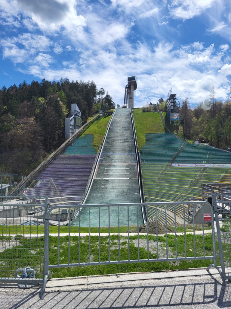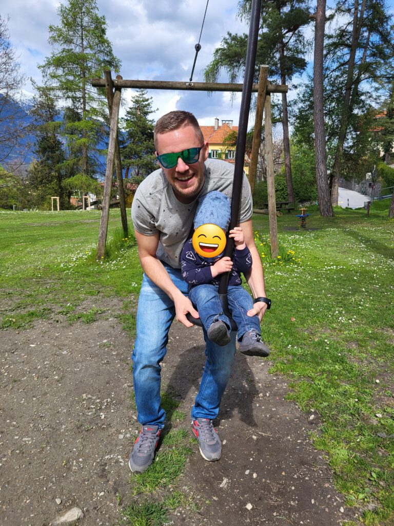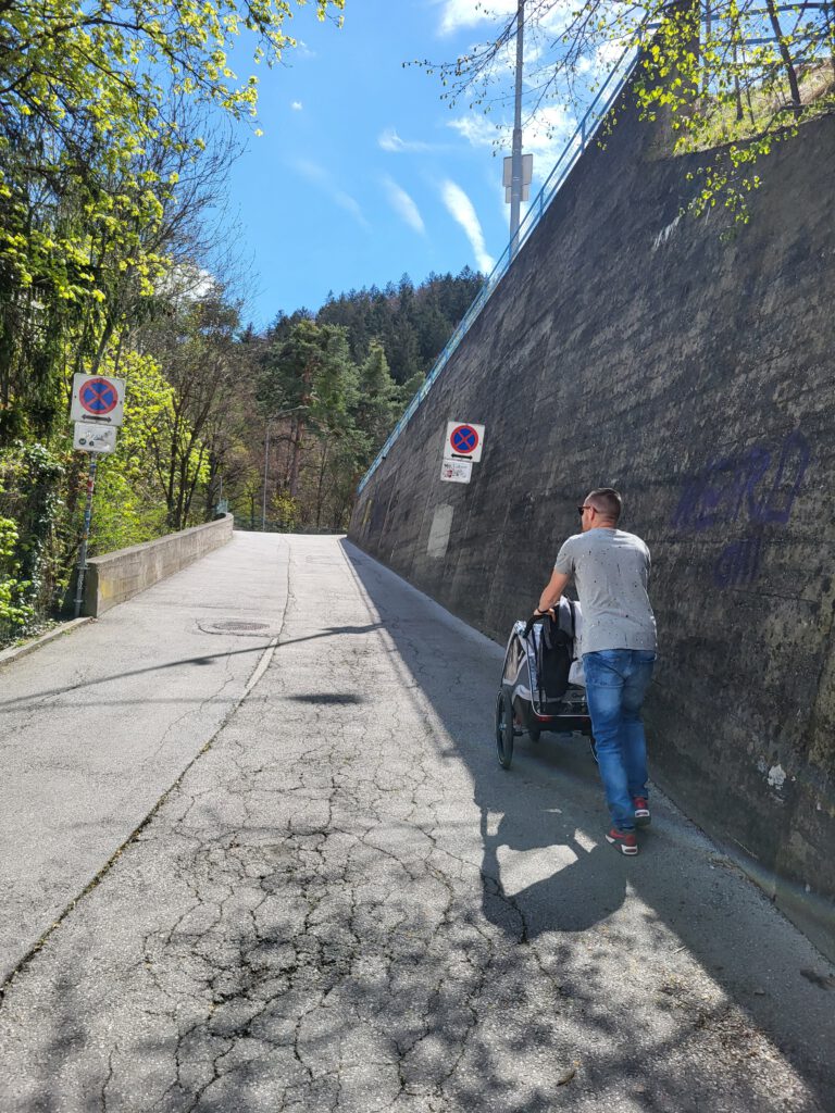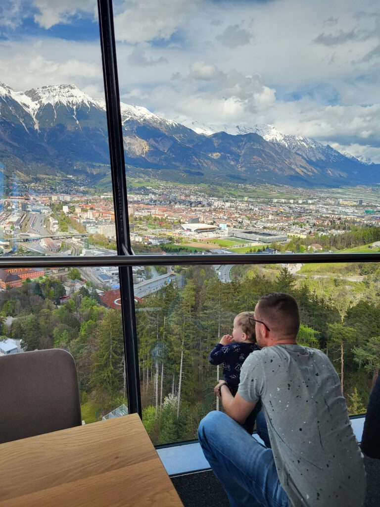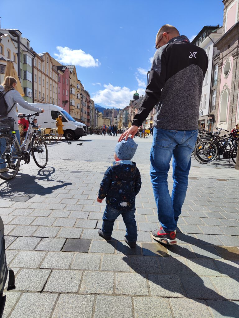 „Happy Birthday“ heißt es für Christian und „Hallo Innsbruck“ für alle. Am Morgen starten wir mit einer kleinen Geburtstagsrunde und immerhin einer Geburtstagskerze. Frühstück gibt’s im Hotel und dann auf ins Zentrum. Wir entschieden uns, mit den öffentlichen Verkehrsmitteln (Bus) zu fahren, da unser Auto mit der Dachbox eventuell zu hoch für Parkhäuser ist, die Parkplatzsuche lästig ist und die Gebühren mindestens so teuer wie unser Familyticket sind. Also auf in die Innenstadt von Innsbruck. Dort angekommen, liefen wir geradewegs in die falsche Richtung (laut Google Maps war ich mir sicher, dass wir richtig sind) und verfehlten das „Goldene Dachl“. Irgendwann haben wir es gefunden und nebenan direkt noch den Swarovski-Store. Unser ViP lief immer dorthin, wo wir gerade nicht hinwollten und er jagte mit Freude die Tauben. Wir besichtigten unter anderem noch den Dom, die Hofkirche und die Hofburg. Am Dom gab es einen kleinen Park mit schönen Frühblühern. Die Sonne zeigte sich hin und wieder und wir nutzen diese, um auf der Bank am Dompark Mittag zu essen. ViP tanzte nach dem Essen zum Glockenläuten und verschenkte Steine an eine ältere Dame. Nun war er endlich müde und schlummerte in seinem Queridoo ein. Die Schlafenszeit nutzen wir, um zur nächsten Attraktion des Tages zu laufen…die Bergisel Schanze. Ganz schön steil bergauf geht es zu ihr, doch wir kamen irgendwann an. Das Stadion ist schon sehr beeindruckend und bereits von dort, hat man einen tollen Blick auf Innsbruck. ViP erwachte und nun konnten wir mit dem Schrägaufzug zum Schanzenturm hoch fahren. Schon etwas gruselig und wackelig dieses Ding. Im Restaurant im Turm oben haben wir uns eine Bergiseltorte gegönnt. Danach ging es noch höher zur Aussichtsplattform…ein wirklich mega toller Blick über ganz Innsbruck, die Autobahnen und Berge. Ab und an sahen wir die Flugzeuge landen und starten…super nah. Und kurz über dem Schanzentisch gibt es eine Miniplattform. Mir war es nicht geheuer dort zu stehen und unvorstellbar, sich dort „hinunter zu stürzen“. Auf dem Weg zum Bus, der uns zum Hotel zurück brachte, machten wir einen Abstecher auf einen Spielplatz. Christian hatte fast mehr Spaß als ViP. Abends im Hotel angekommen, waren wir platt. Aber bevor wir ins Bett fielen, holte Christian zum Geburtstagsessen Burger und Pommes von einem „echten“ Burgerladen. War sehr lecker.